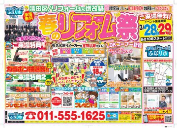 あんなにたくさんあった雪も溶け始め 少しずつ春らしくなってきましたね~(*^^*) 新学期・新生活がスタートする春に先がけ「ふなリホ平岡店」も 新しくリニューアルOPENさせていただくことになりました(^^)/ LDKコーナーを新たに新設♪ お客様にリフォームをよりイメージしやすいショールームへ生まれ変わります! 3月28日(土)・29日(日) AM10:00~PM5:00 「春のリフォーム祭」 開催いたします(^^)v ご来場特典として、 ご来場者全員にオリジナルタオル&箱ティッシュをプレゼント♪ アンケートご記入いただいた方対象で ガラポン抽選会‼ お子様にお菓子のプレゼント(^^)/ キッチン人気投票・現地調査・お見積り特典 などなど、お楽しみ企画をたくさんご用意しておりますので、 ご家族、お友達などお誘い合わせの上、ご来店下さい(*^^*) 忙しい時期ではありますが、 「ちょっと寄ってみようかな」と感じていただけたら嬉しいです。 スタッフ一同、皆さまのご来場をお待ちしています!